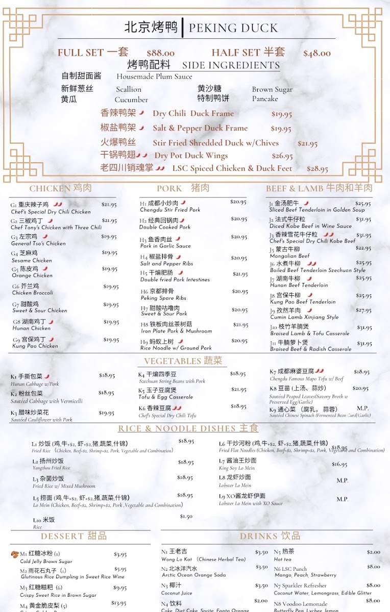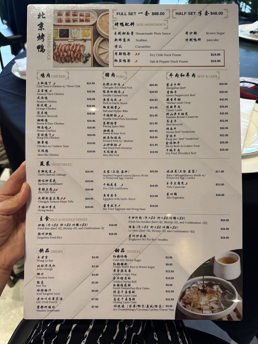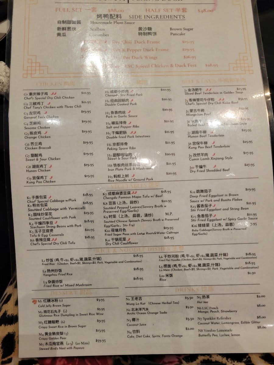 Highlights such as Peking Duck, Chengdu Stir-Fried Pork, and the chef’s dry chili tofu provide a glimpse into the rich variety of flavors—from spicy and numbing to savory and aromatic. Soups like the hot and sour or chef’s special duck soup offer warming starts, while cold appetizers including sliced beef and tripe or crunchy cucumber salad invite refreshing contrasts.